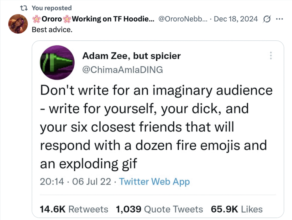 «Не пишите для воображаемой аудитории – пишите для себя, для Вашего члена, для Ваших шести близких друзей которые ответят Вам десятками огненных эмодзи и взрывающейся гифкой«